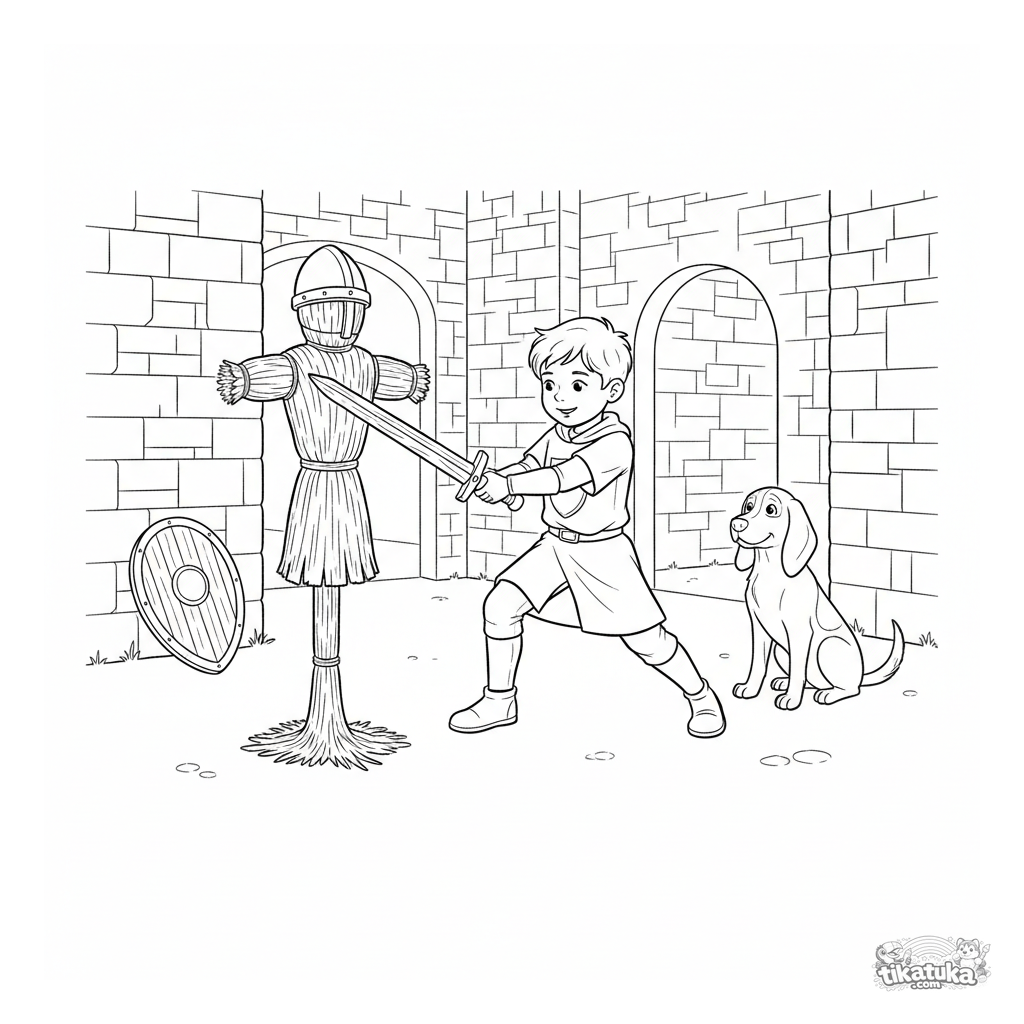 Página para colorear para niños 5-8 años: un joven caballero con túnica heráldica practica con una espada de madera contra un maniquí de paja en el patio de un castillo, observado por un sabueso leal.