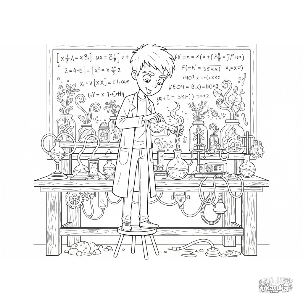 Página para colorear detallada para niños de 10-12 años: un joven científico realiza un experimento de química con líquido brillante en un laboratorio secreto.