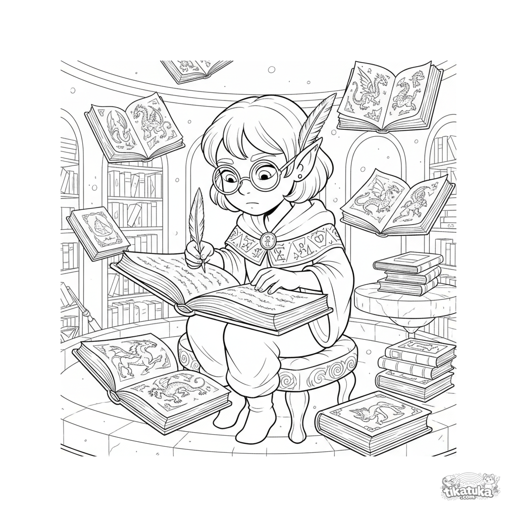 Página para colorear para niños mayores 10-12: un joven escriba elfo catalogando libros flotantes antiguos en una biblioteca mágica circular.