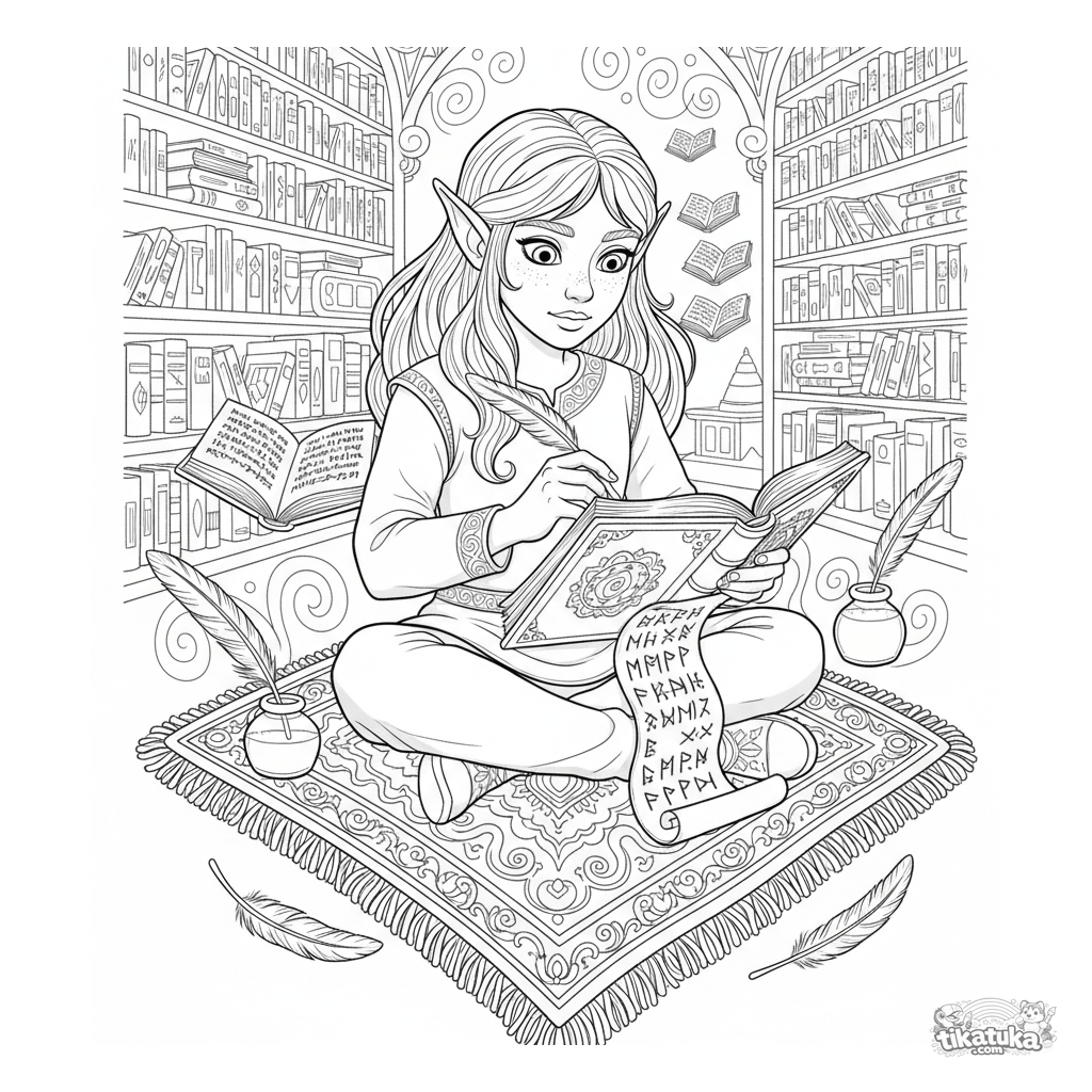 Página para colorear para 10-12 años: un joven escriba elfo copiando hechizos en una biblioteca flotante. Escena detallada con libros y pergaminos.