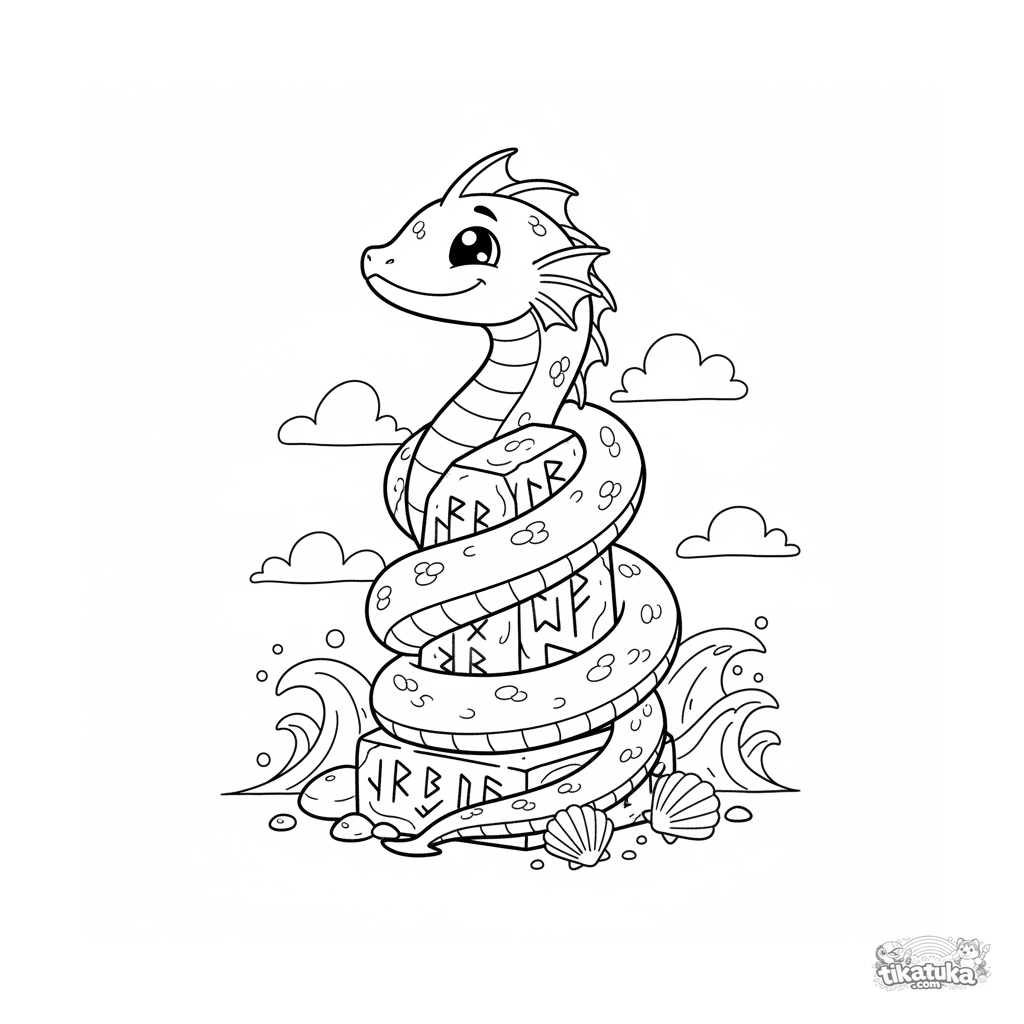 Página para colorear para niños 7-9: una amigable serpiente marina joven se enrosca alrededor de un antiguo monolito brillante con runas. Pose dinámica, detalles de fondo.