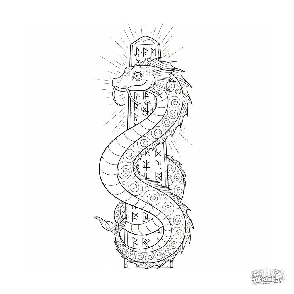 Página para colorear de una joven serpiente marina explorando un antiguo monolito rúnico. Para niños mayores de 10-12 años. Ilustración detallada de una criatura mítica.