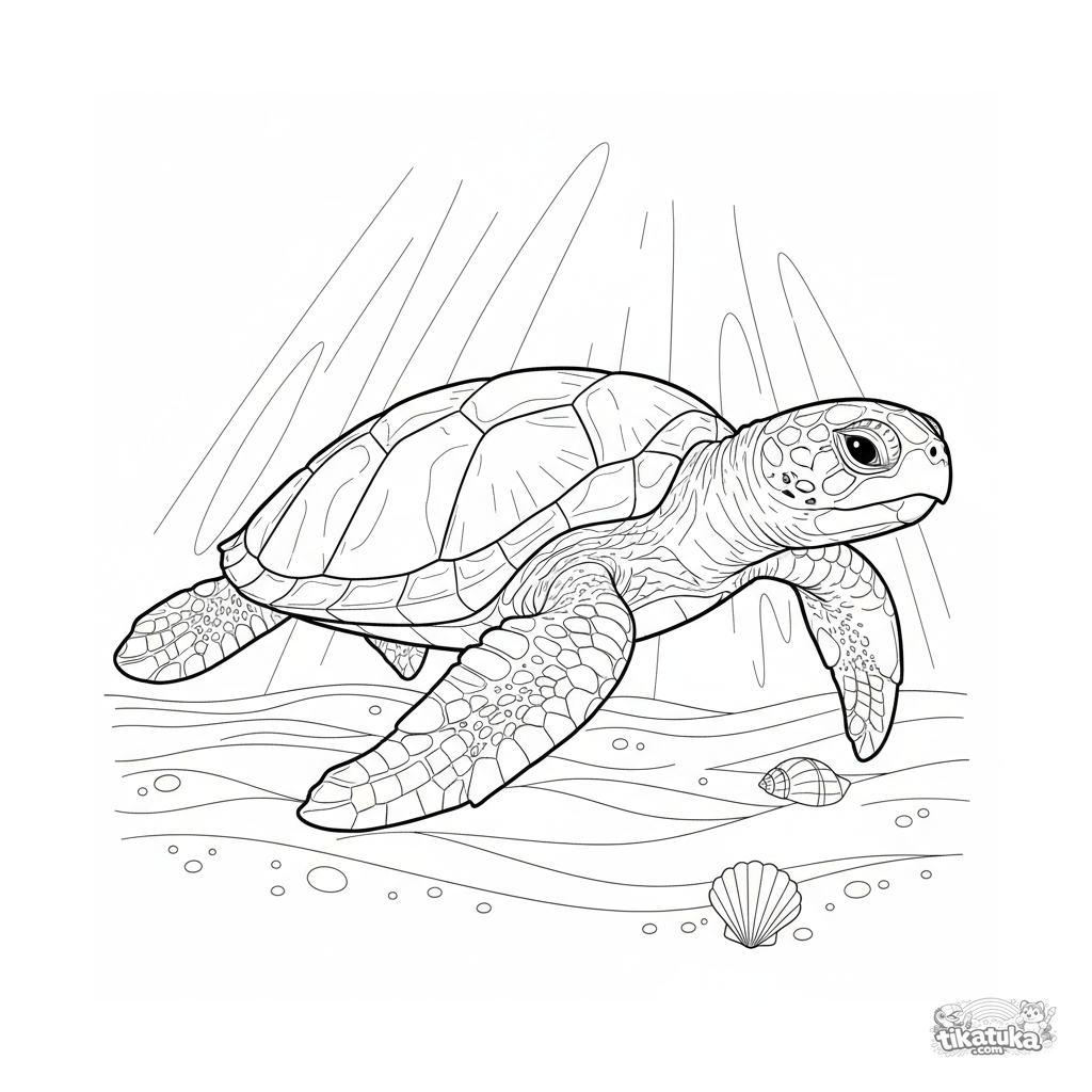 Página para colorear detallada de una tortuga marina joven deslizándose sobre el fondo arenoso en aguas poco profundas y soleadas. Para niños mayores de 10 a 12 años.