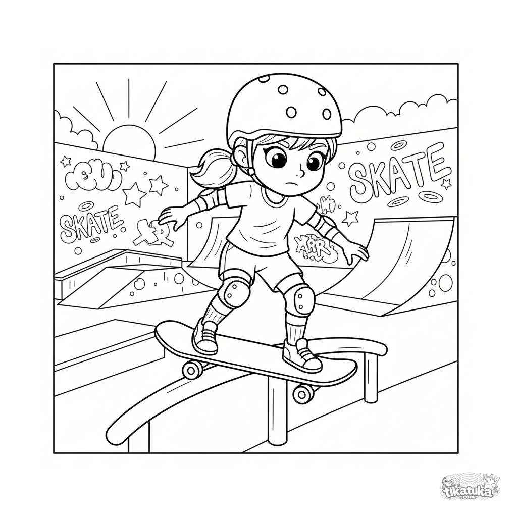 Página para colorear para niños 4-6: una chica en monopatín manteniendo el equilibrio sobre una baranda en un parque de patinaje. Escena deportiva divertida con equipo de protección.