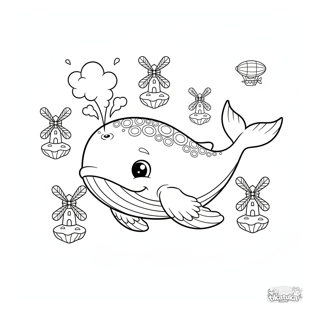 Página para colorear de una ballena celestial joven nadando entre islas flotantes con velas de cristal. Para niños de 7-9 años.