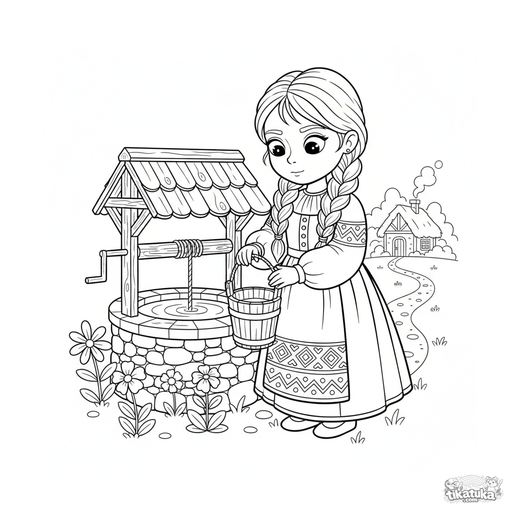 Página para colorear para niños 4-6: una niña con traje folklórico saca agua de un pozo. Formas simples, historia clara.