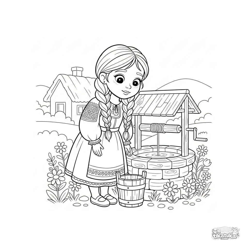 Página para colorear para niños 4-6: una niña con vestido tradicional junto a un pozo de agua viva. Formas simples, escena clara.