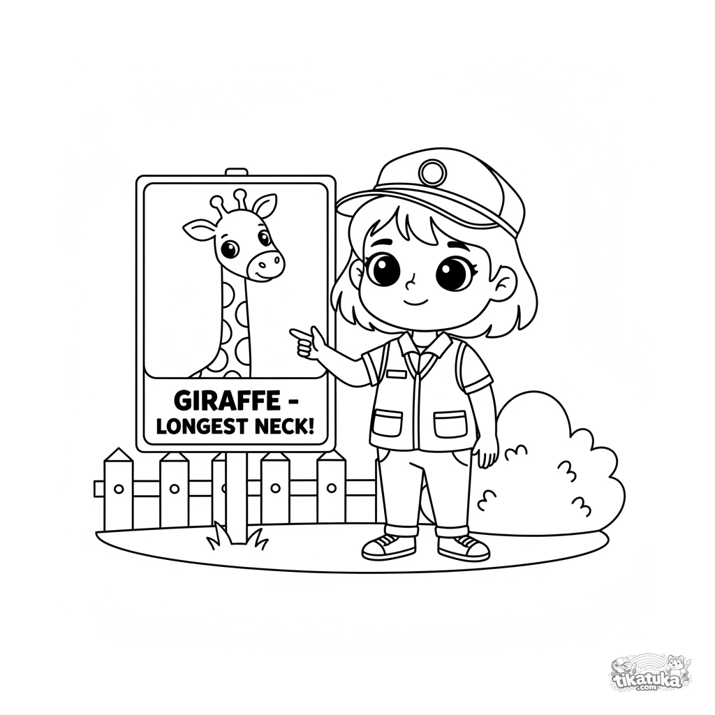 Página para colorear para niños de 4-6 años: un joven guardián explica datos sobre jirafas junto a un cartel informativo. Escena de aprendizaje simple.