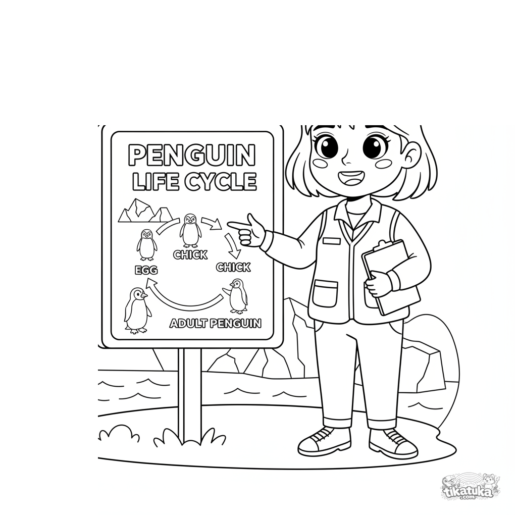 Página para colorear para niños 4-6: un joven cuidador explica la información del hábitat de los pingüinos. Aprende sobre profesiones y animales.