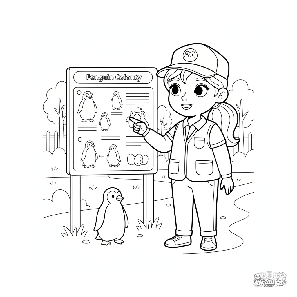 Página para colorear para niños de 4-6 años: un joven cuidador explica la información de un cartel sobre pingüinos. Escena educativa en el zoológico.