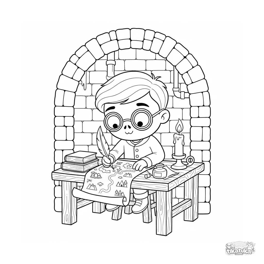 Página para colorear para niños 4-6: un zombi cartógrafo dibujando un mapa en un nicho de ladrillo en la alcantarilla.