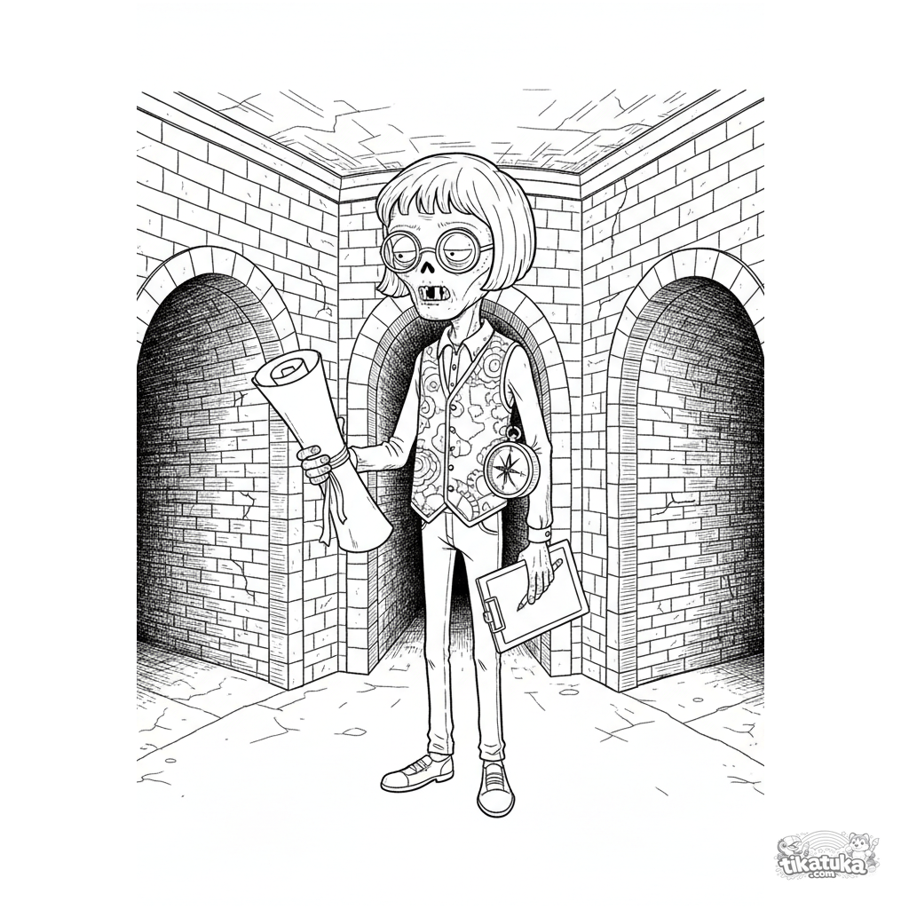 Página detallada para colorear para niños 10-12: un zombi cartógrafo con mapa y brújula estudia un cruce de túneles en un colector. Estilo de grabado vintage.