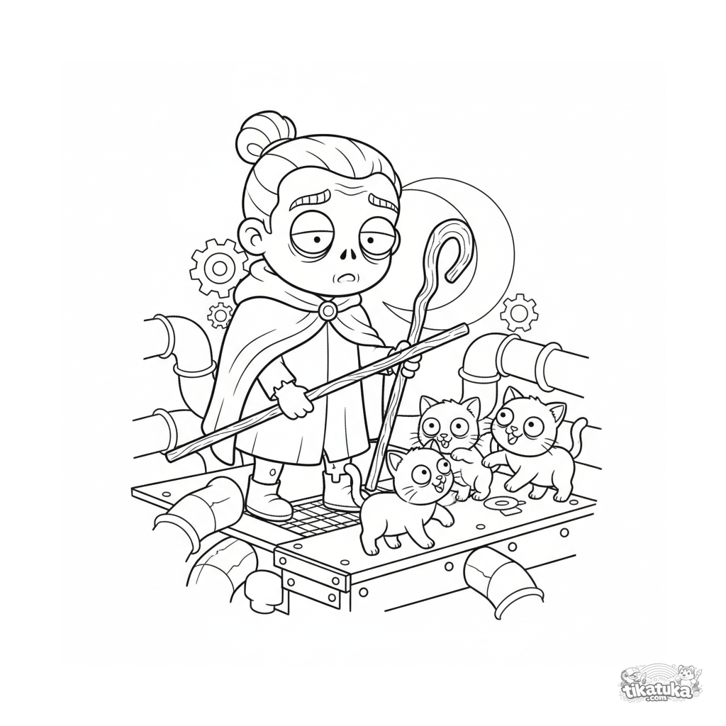 Página para colorear para niños de 4-6 años: un zombi amable tratando de pastorear gatitos zombis en una plataforma de alcantarillado. Estilo de marioneta suave.