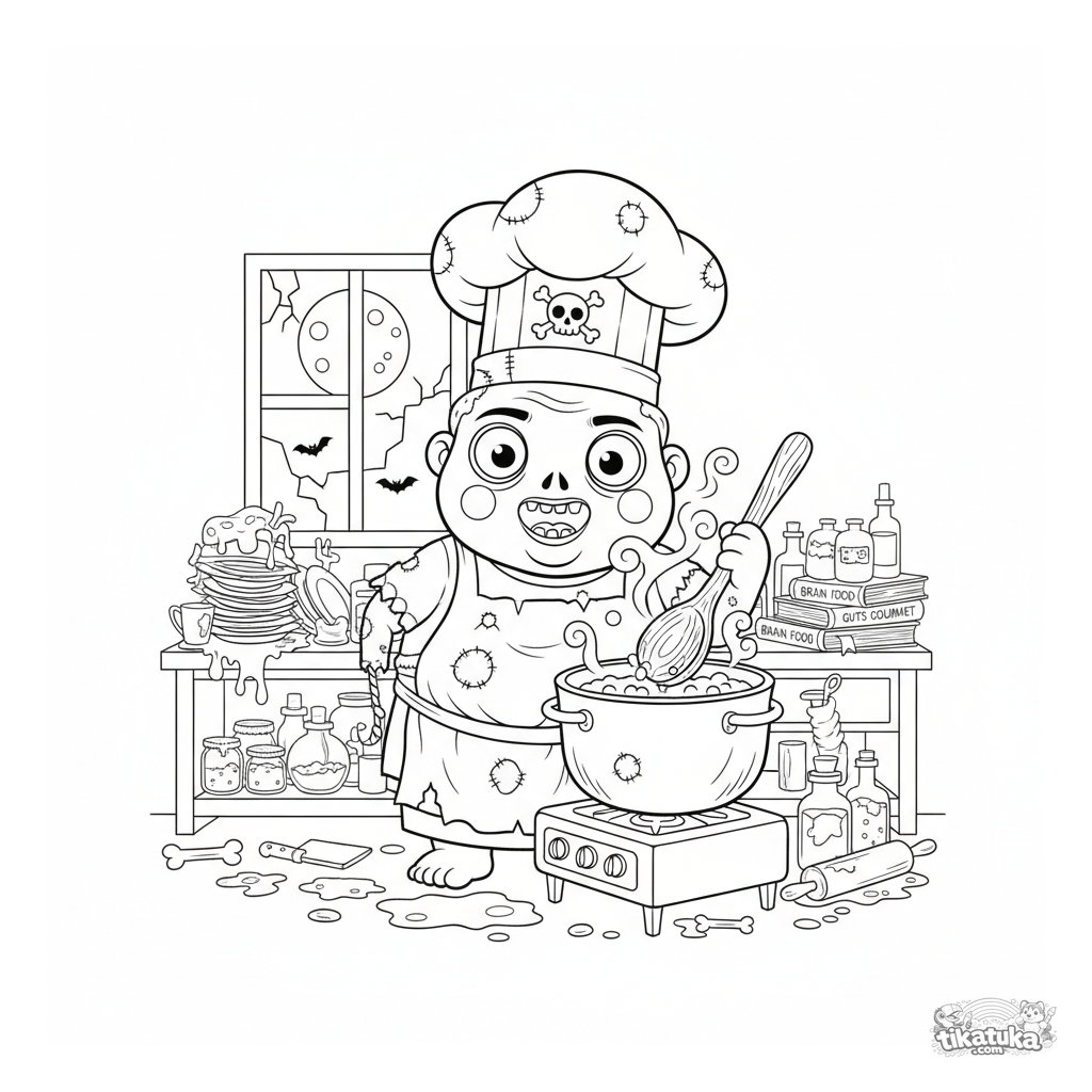 Página para colorear divertida para niños de 4-6 años: un chef zombie amigable revolviendo una olla grande. Escena tierna y no aterradora.