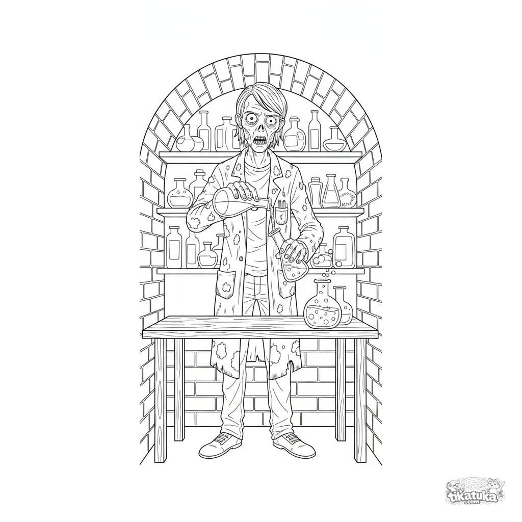 Página detallada para colorear para niños de 10-12 años: un zombi químico realiza un experimento en un laboratorio subterráneo de alcantarillado.