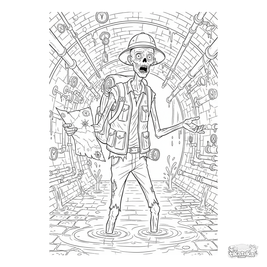 Página detallada para colorear para niños de 10-12 años: un zombi explorador con un mapa en una cámara de alcantarillado inundada. Muchos elementos para colorear creativamente.