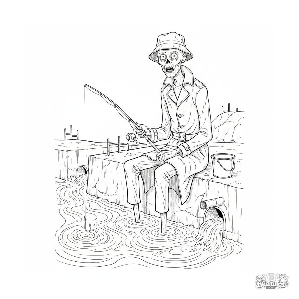 Página detallada para colorear para niños de 10-12 años: un zombi pescador realista esperando pacientemente en un canal de alcantarillado. Contornos claros.