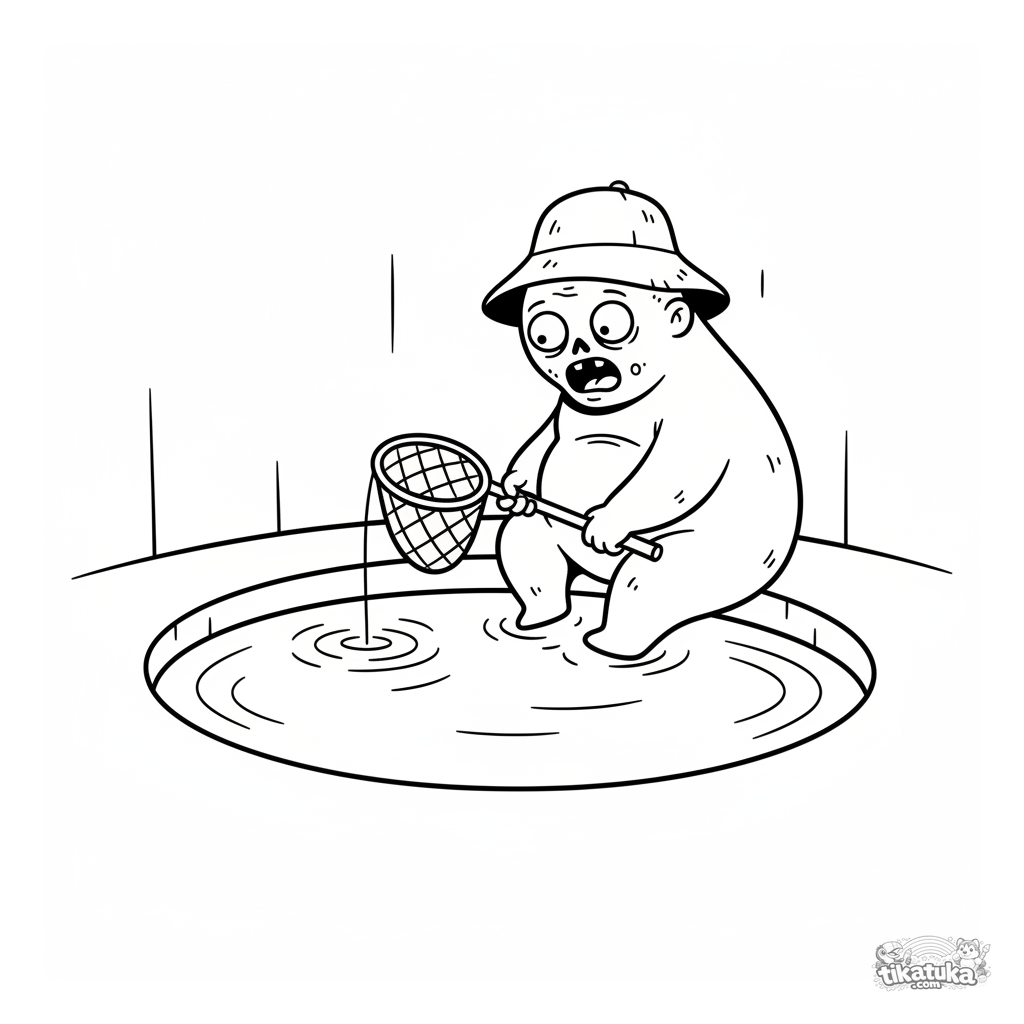 Página simple para colorear para bebés de 2-3 años: un zombi pescador amigable sentado junto al agua en un colector. Formas grandes, pocos detalles.