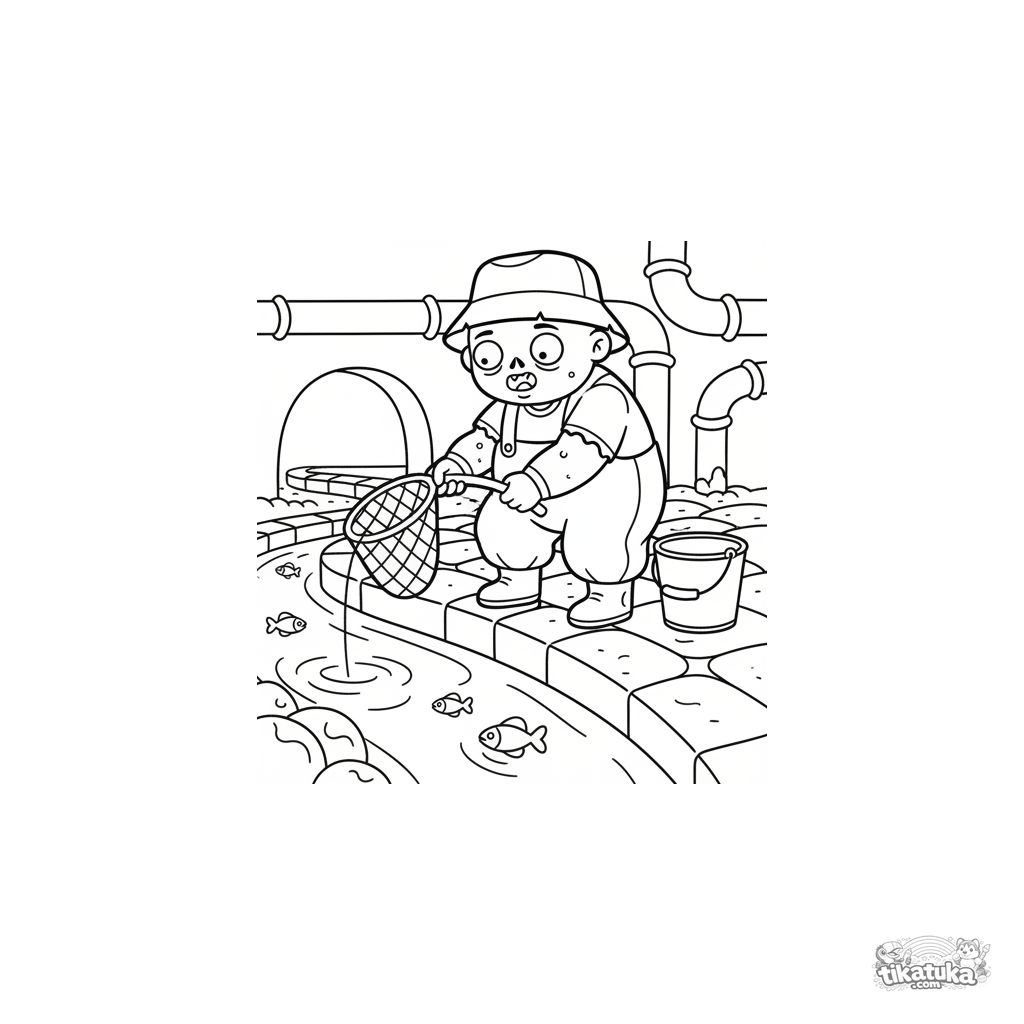 Página para colorear para niños 4-6: un zombi pescador divertido con botas altas lanzando una red a un canal de agua en el colector. Escena en estilo folclórico.