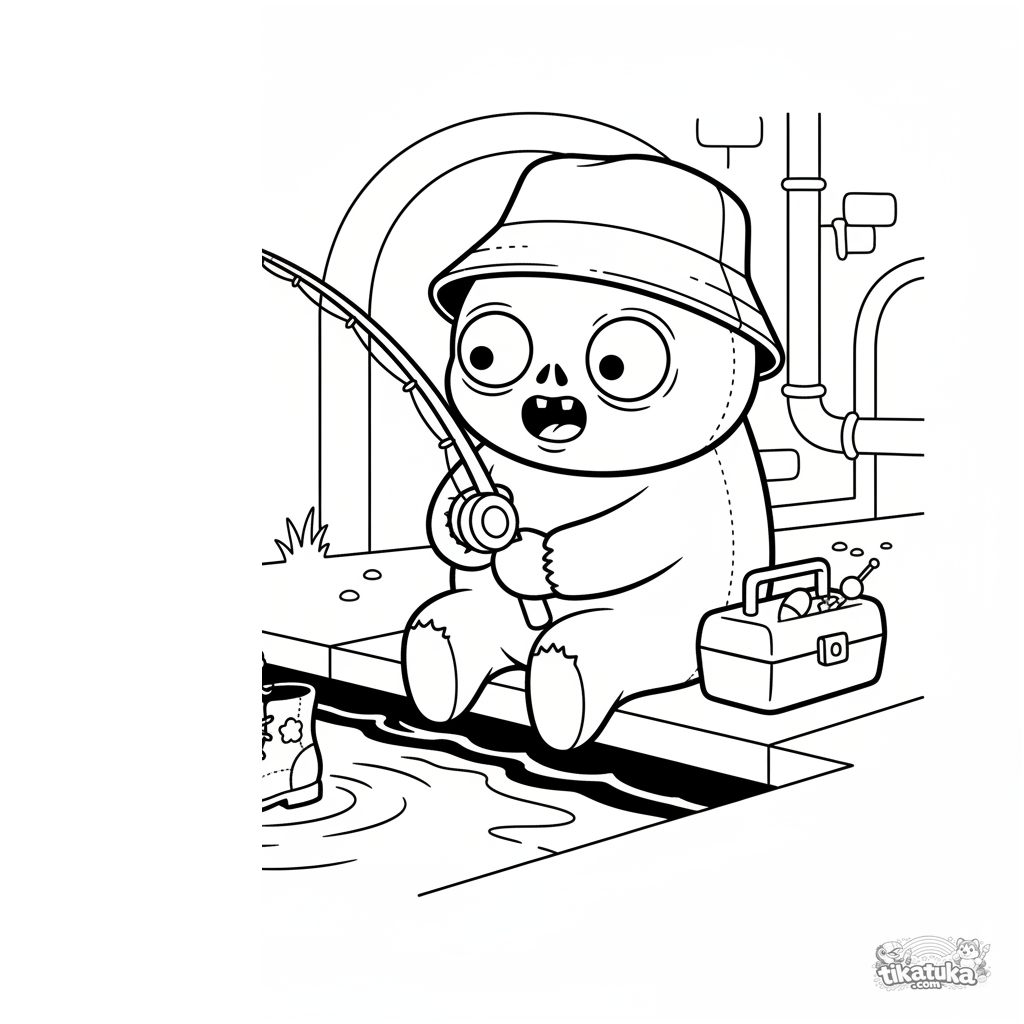 Página para colorear para niños 4-6: un zombi redondo y bonachón en la alcantarilla intenta pescar una bota vieja con una caña. Escena divertida y simple para colorear.