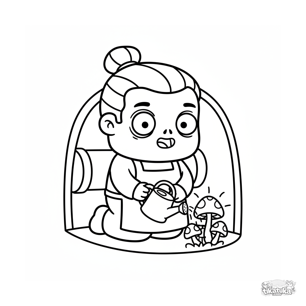 Página para colorear para niños pequeños 2-3: un zombi jardinero regando hongos brillantes en una alcantarilla. Formas muy simples y grandes.