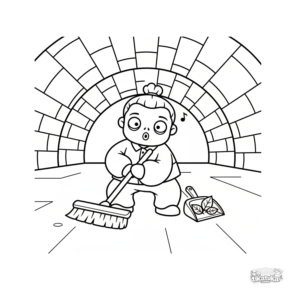 Página muy simple para colorear para niños pequeños de 2-3 años: un zombi conserje barre el suelo en una gran sala de alcantarillado.