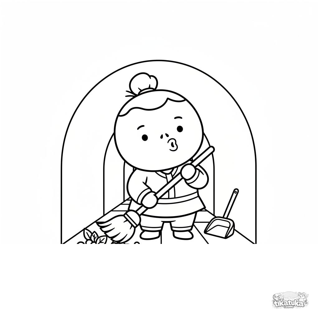 Página muy simple para colorear para niños pequeños de 2-3 años: un zombi conserje barriendo un pasillo en un colector.