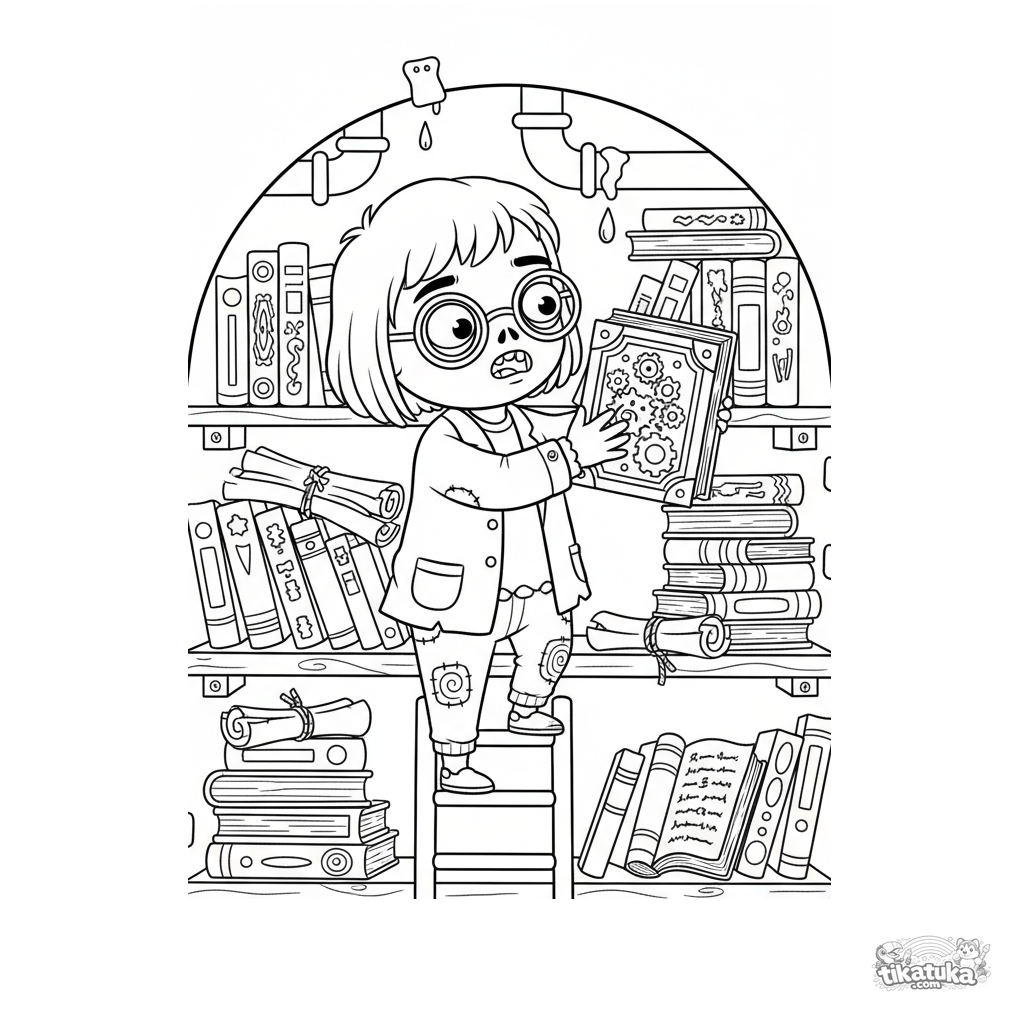 Página para colorear detallada para niños 10-12 años: un zombi bibliotecario organiza libros en un archivo subterráneo en un colector. Muchos elementos, estilo ilustración libro.