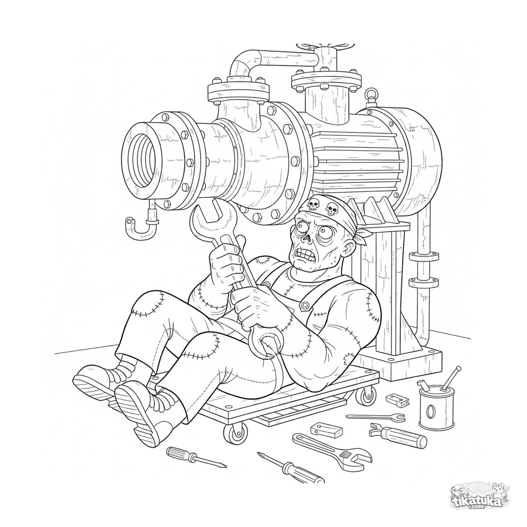 Página compleja para colorear para niños 10-12 en estilo técnico: un zombi mecánico con una llave inglesa repara una gran bomba oxidada en una sala de máquinas de alcantarilla.