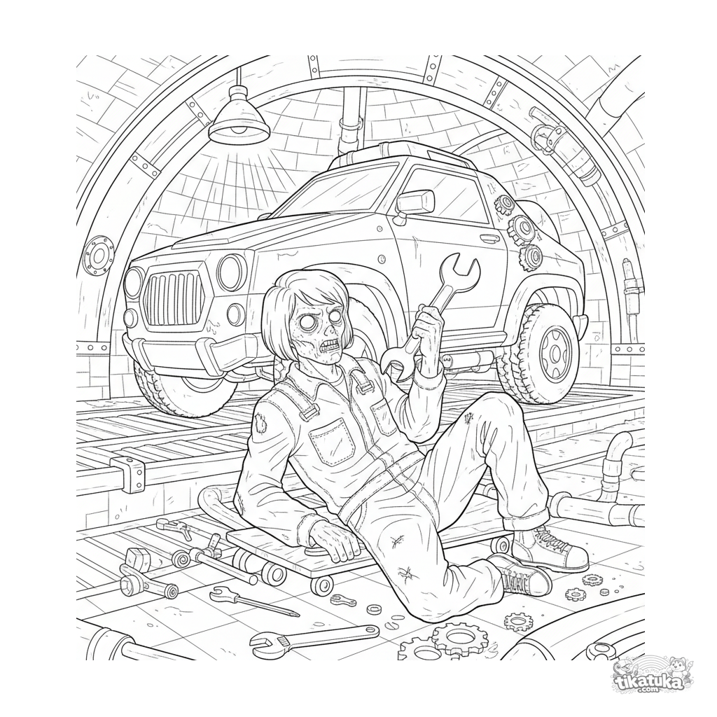 Página detallada para colorear para niños de 10-12 años: un zombi mecánico repara un vehículo inusual en un taller improvisado en una alcantarilla.