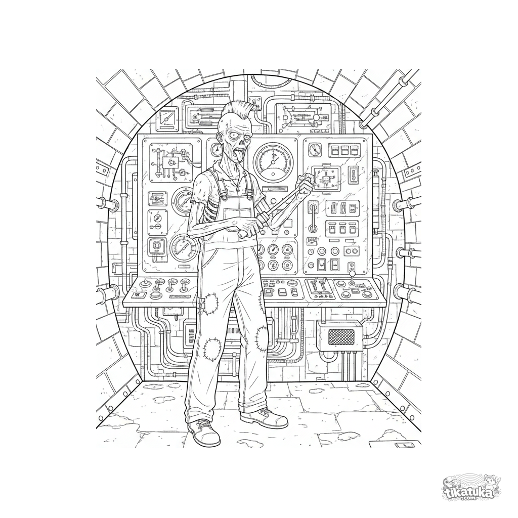Página para colorear compleja de un zombi mecánico trabajando en un panel de control en un colector de alcantarillado. Para niños de 10 a 12 años. Estilo técnico.