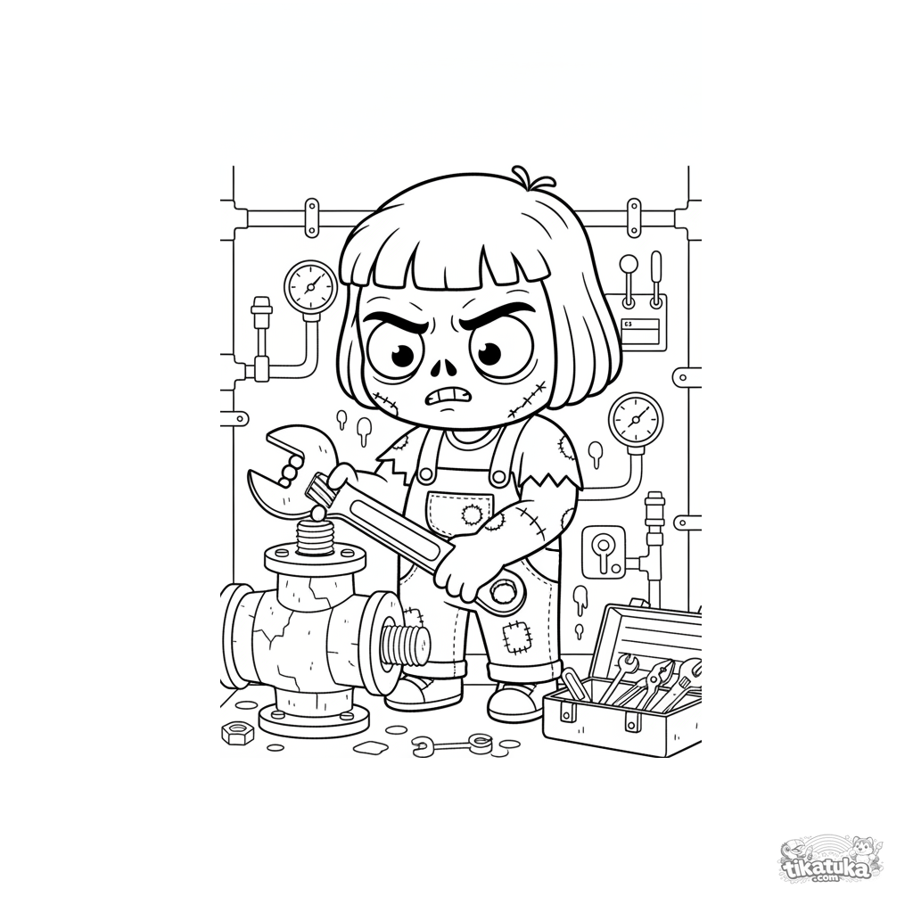 Página para colorear para niños: un zombi mecánico repara una bomba grande en una estación dentro de la alcantarilla. Formas claras, escena comprensible. Para niños de 4 a 6 años.