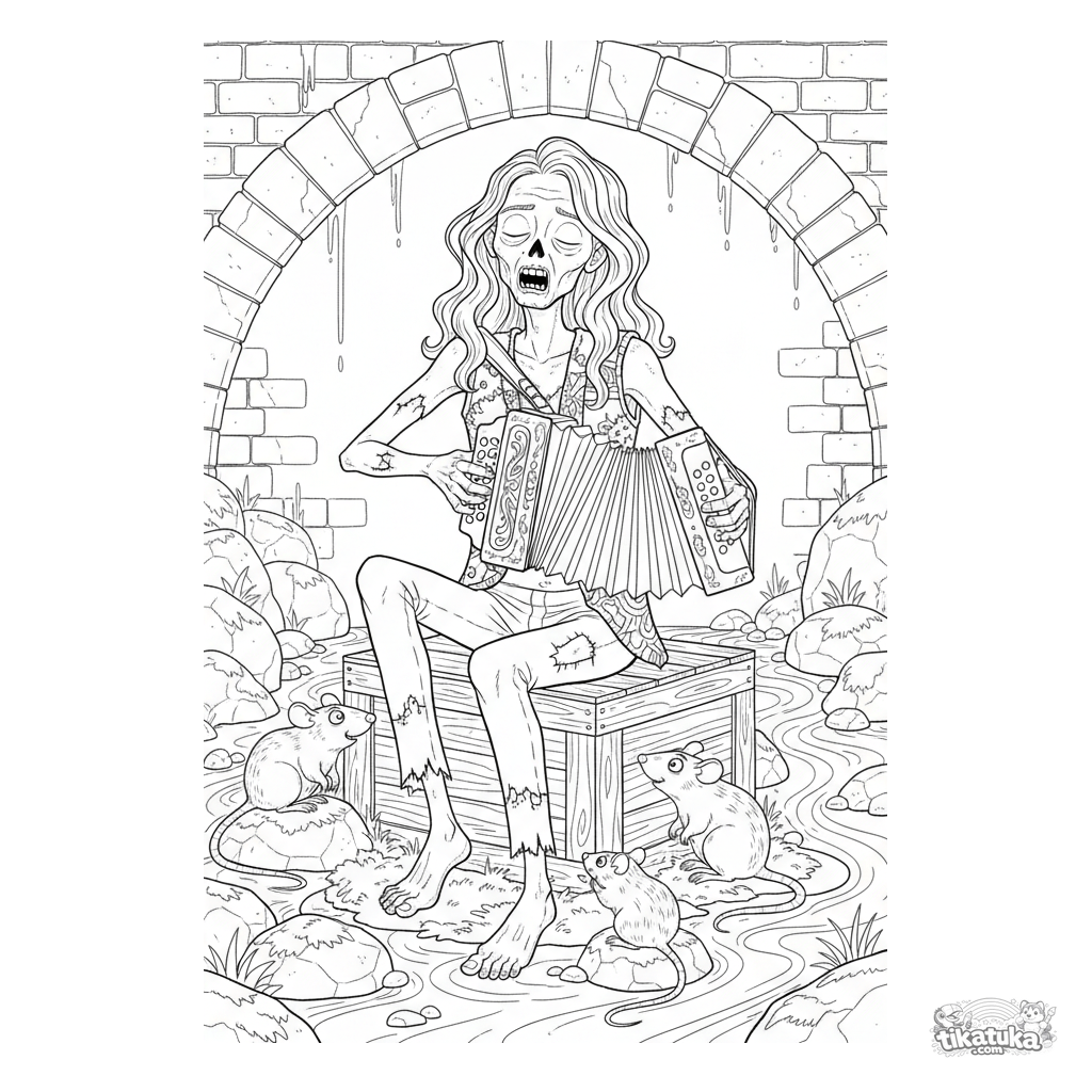 Página detallada para colorear para niños de 10-12 años: un zombi músico tocando el acordeón en una cámara de alcantarilla. Escena atmosférica con detalles.