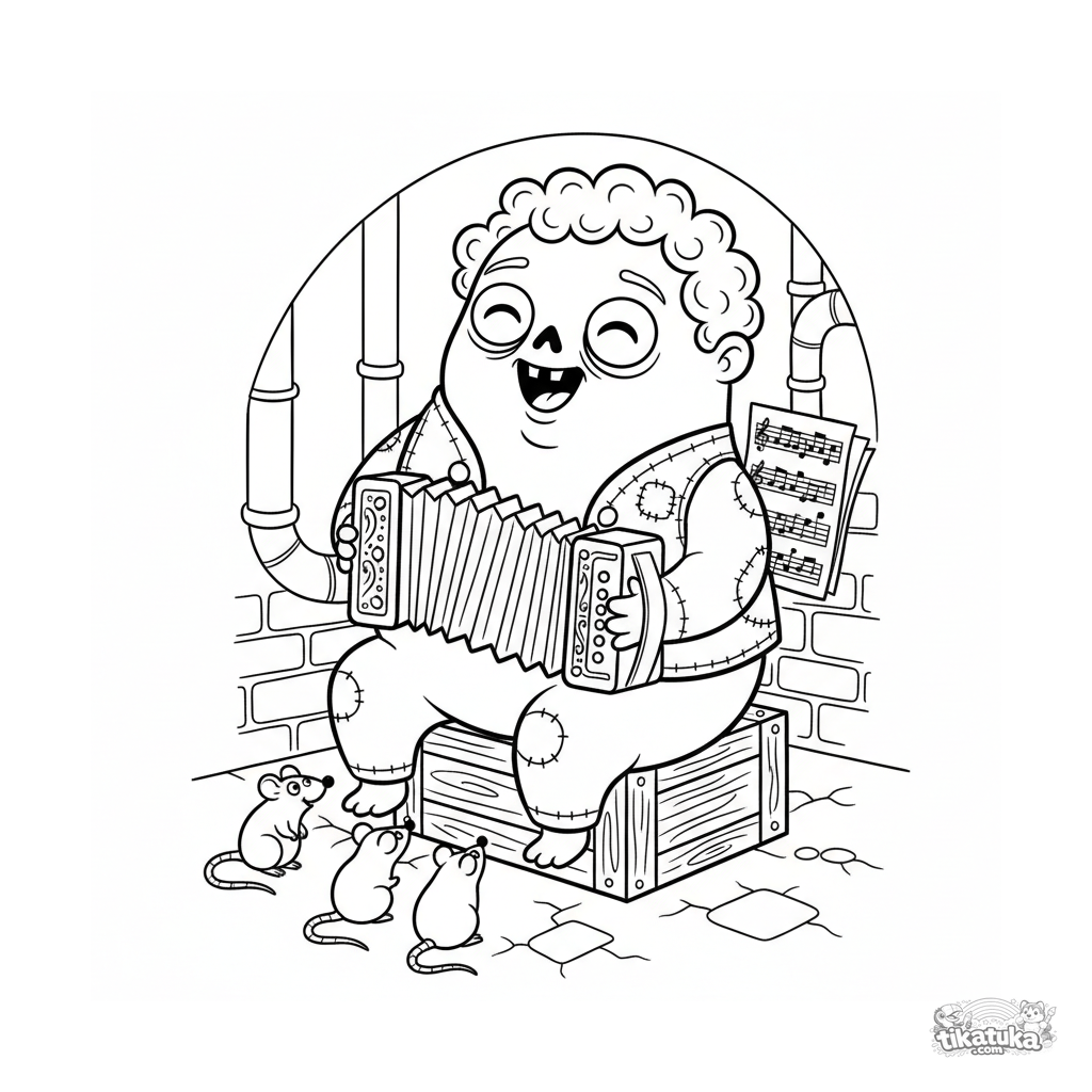 Página para colorear para niños 4-6: un zombi músico tocando un acordeón en una pasarela de alcantarillado.