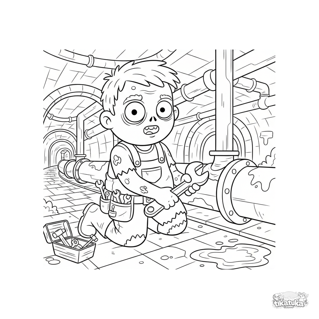 Página para colorear para niños 4-6: un zombi fontanero amigable arreglando una tubería en un gran colector de alcantarillado. Escena divertida y no aterradora.