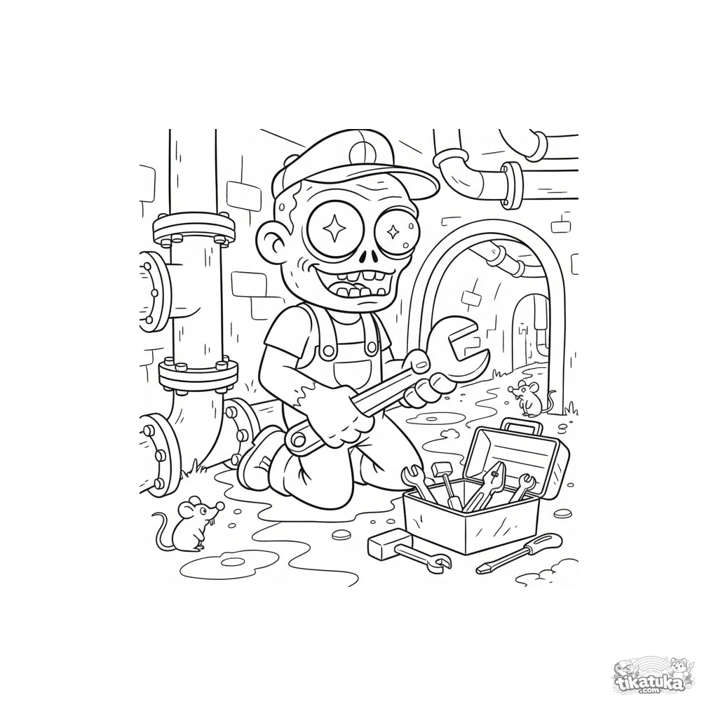 Página para colorear para niños de 7-9 años: un zombi fontanero amigable trabajando con herramientas en un túnel de alcantarillado. Escena divertida y no muy aterradora.