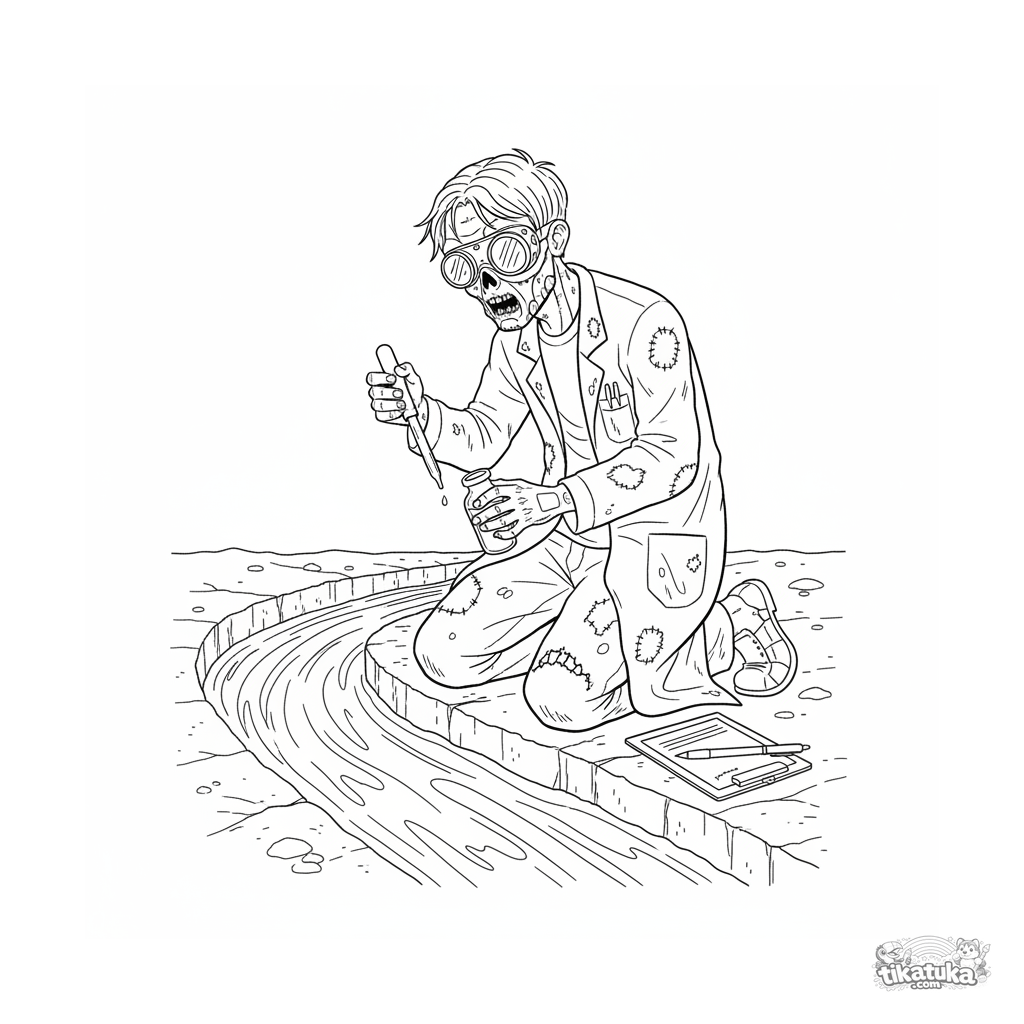Página técnica para colorear para niños 10-12: un zombi científico en un laboratorio de alcantarillado tomando una muestra de agua. Estilo de plano.