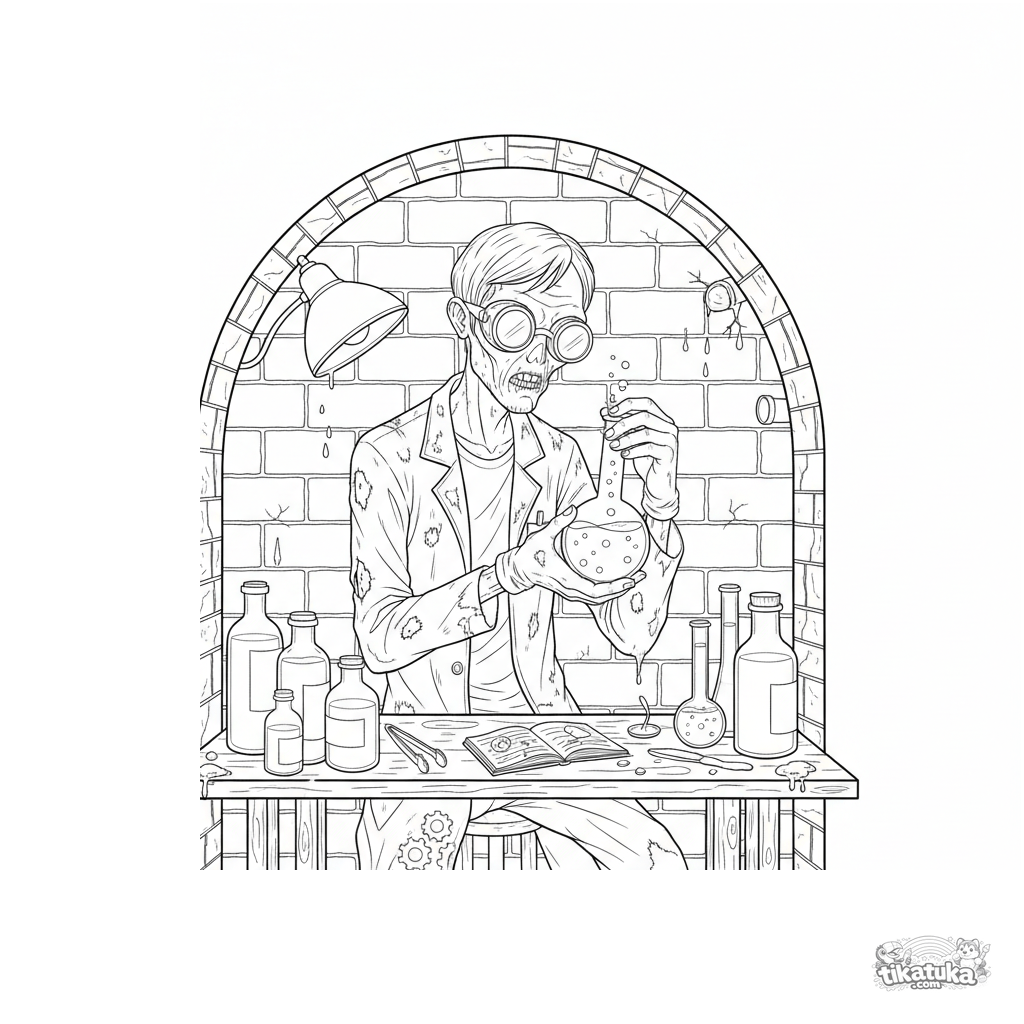 Página para colorear compleja para niños 10-12: un zombi científico en un laboratorio instalado dentro de un túnel de alcantarilla examina muestras de agua. Escena técnica detallada.
