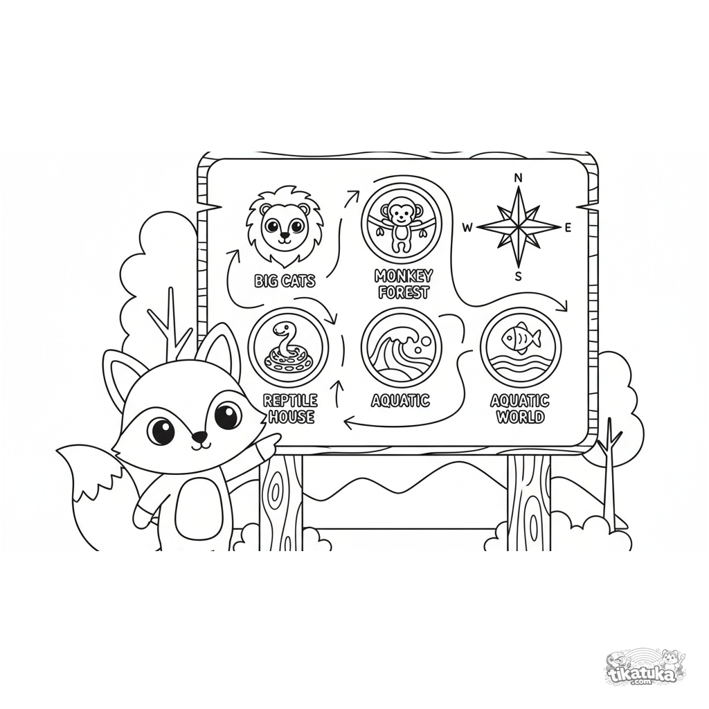 Página para colorear para niños 7-9 años: un mapa grande del zoológico con rosa de los vientos. Un zorro guía amigable señala el camino. Enseña orientación.
