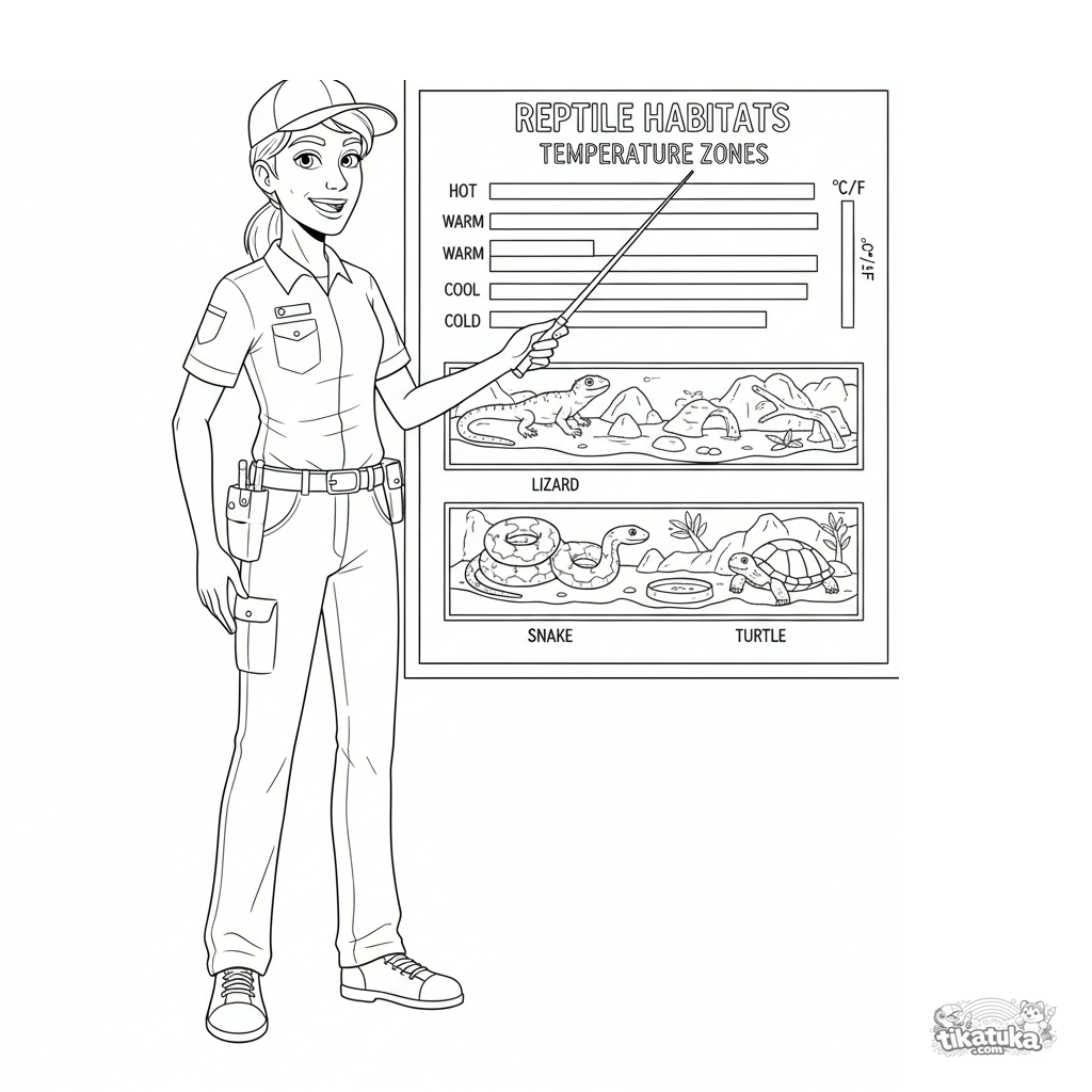 Página para colorear para niños de 10-12 años. Un voluntario del zoológico explica un gráfico de temperatura para reptiles usando un tablero informativo. Ilustración científica detallada.