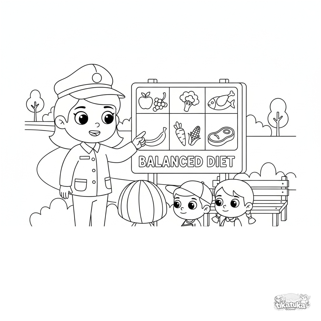 Página para colorear para niños 4-6: un cuidador del zoológico explica en un cartel qué comen los animales. Escena educativa sobre nutrición y profesiones.