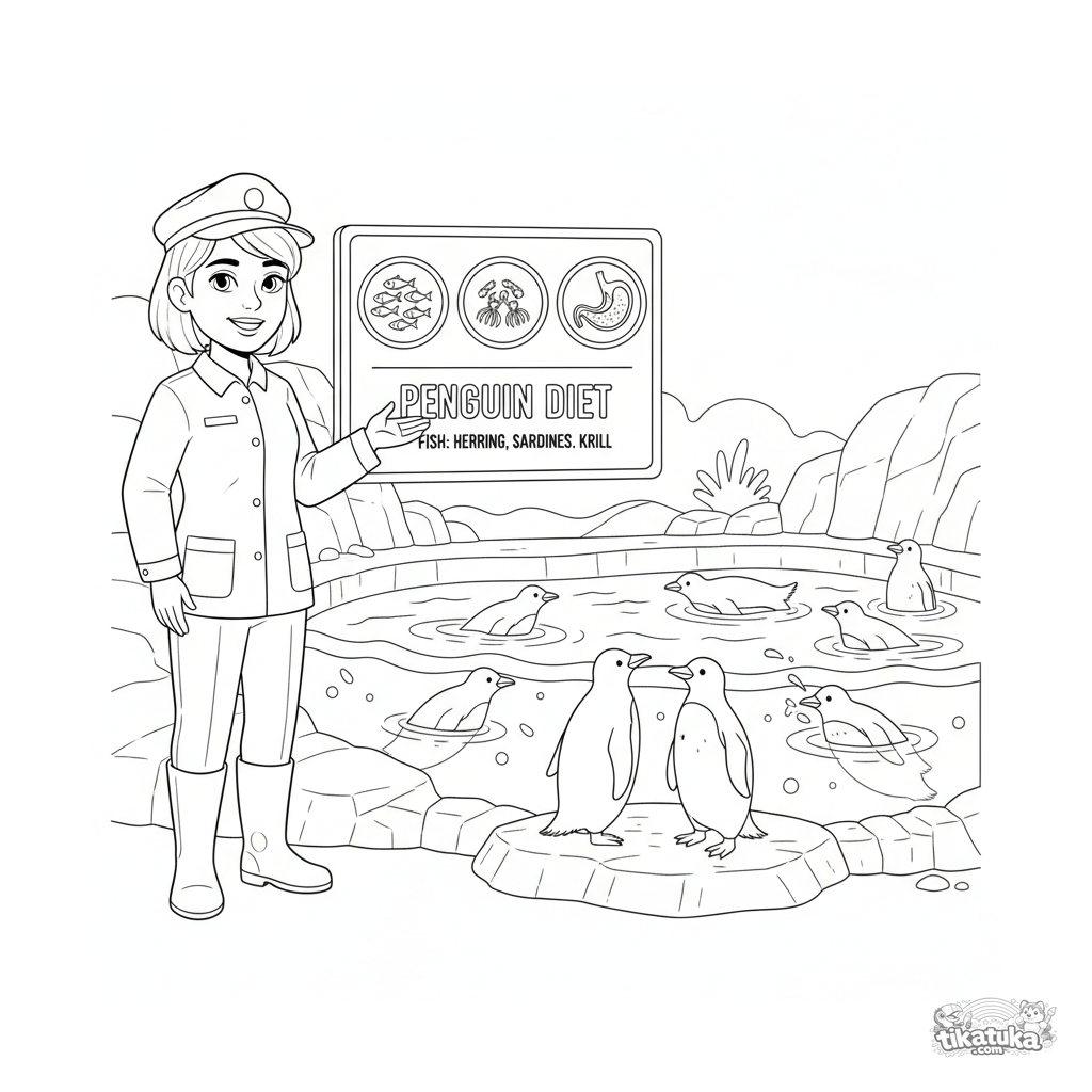 Página para colorear detallada para niños de 10-12 años: un cuidador explica la dieta de los pingüinos en un panel informativo.