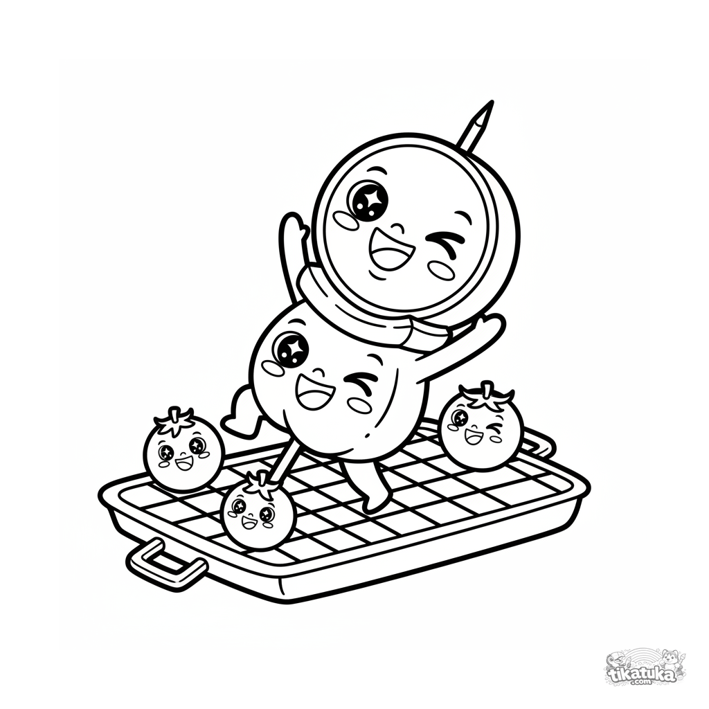 Página simple para colorear para niños pequeños de 2-3 años: una brocheta de verduras en la parrilla. Formas grandes y claras de calabacín y pimiento bailando.