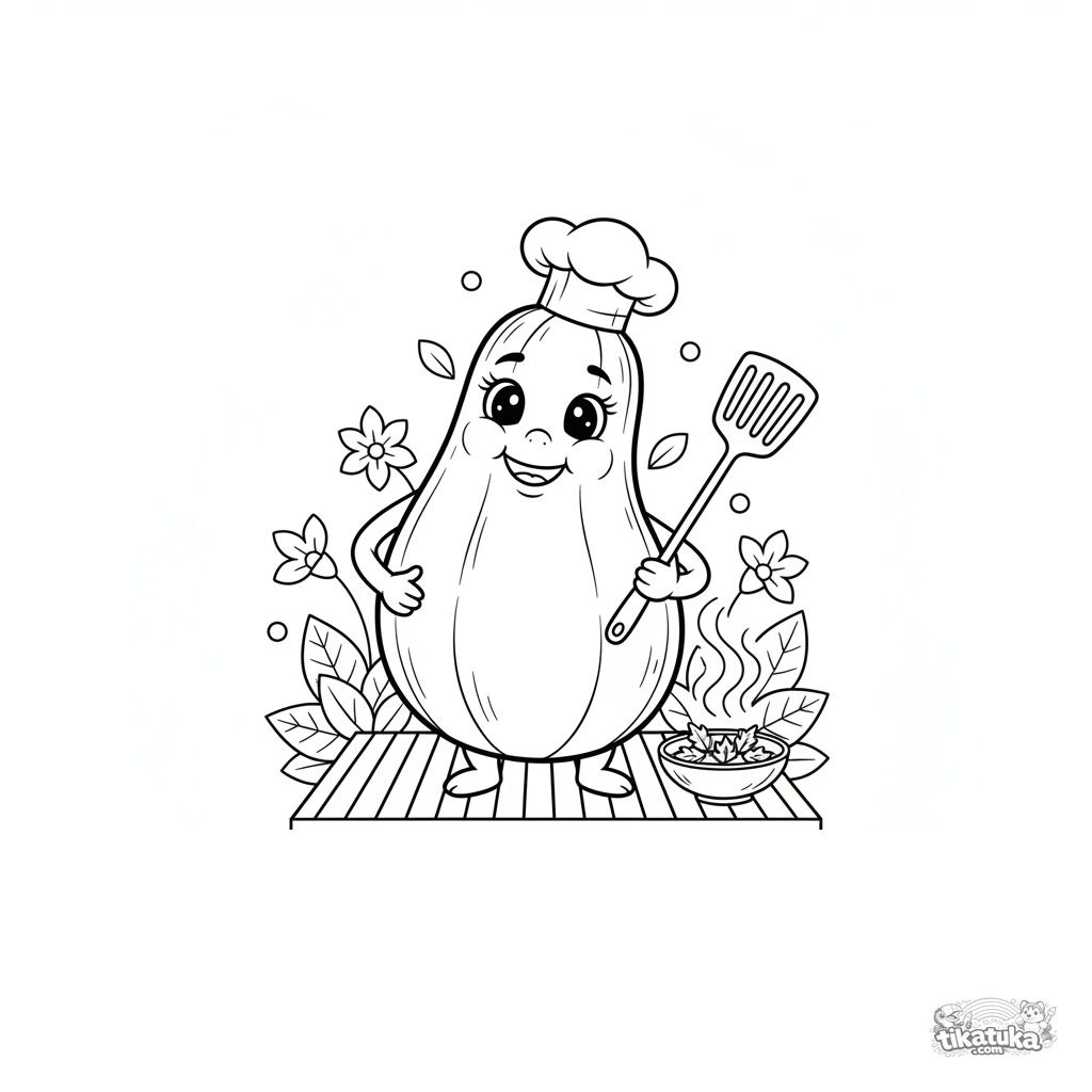 Página para colorear para niños 4-6: un calabacín sonriente con gorro de chef cocina en una parrilla de jardín.