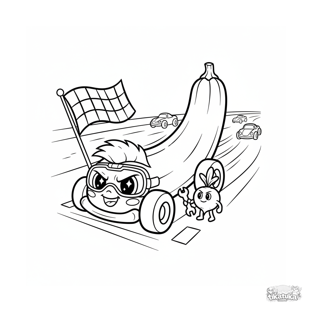 Página dinámica para colorear para niños 7-9: un calabacín como coche de carreras en la salida. Estilo cómic, detalles expresivos.