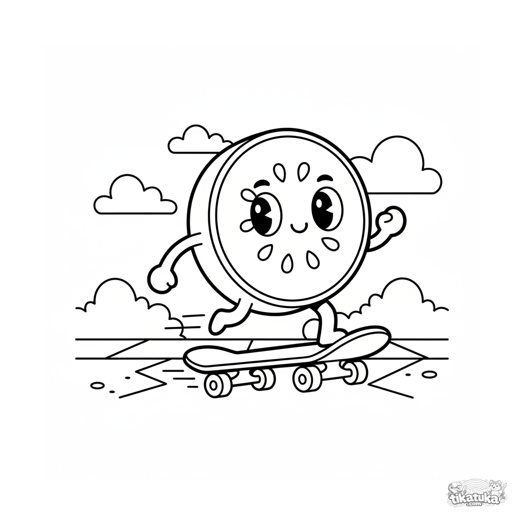 Página para colorear divertida para niños 4-6: una rodaja de calabacín monta monopatín. Estilo pegatina pop con contornos gruesos.