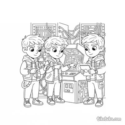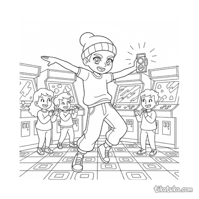 Encontrarás escenas de jugadores coleccionando pines, grupos de música tocando entre las máquinas y tríos de gamers disfrutando de sus partidas. También hay ilustraciones de modificadores probando controles y bailarines callejeros actuando en un rincón del local. Todas las ilustraciones de Arcade están en blanco y negro, con líneas claras perfectas para que los niños se concentren en colorear los detalles de las máquinas y la ropa de los personajes. Puedes descargar e imprimir cualquiera de estas páginas de forma gratuita, ideal para crear un cuadernillo de actividades con temática arcade.