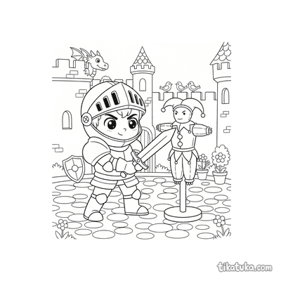 También hay escenas de justas, escuderos puliendo la armadura y caballeros enfrentándose a desafíos como calabazas rodantes, todo ambientado cerca de castillos medievales.