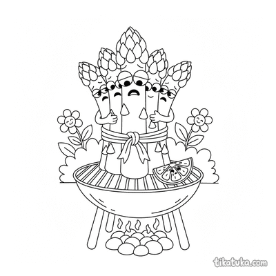 Encontrarás atados de espárragos con cebollino, espárragos a la parrilla y versiones chibi o de peluche en un huerto. Los dibujos capturan manojos de espárragos con detalles claros y contornos definidos. Puedes descargar e imprimir estos dibujos en blanco y negro para colorear con lápices o rotuladores. Los trazos están pensados para que los niños puedan pintar fácilmente dentro de las líneas.