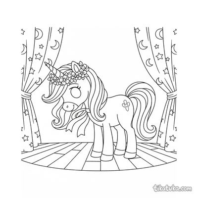 En estas páginas, los pequeños artistas podrán colorear a una compañía de ponis saludando juntos al final del espectáculo, a un potro haciendo su primera reverencia en su debut escénico con un lazo grande, y a una princesa guerrera que practica tiro con arco. También hay ilustraciones de un poni unicornio mágico saludando y de un poni realista inclinándose ante el público.
